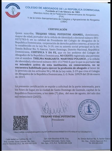 El documento, firmado por su presidente Trajano Vidal Potentini, establece que la persona no figura como miembro activo ni posee autorización para ejercer conforme a la Ley 3-19.