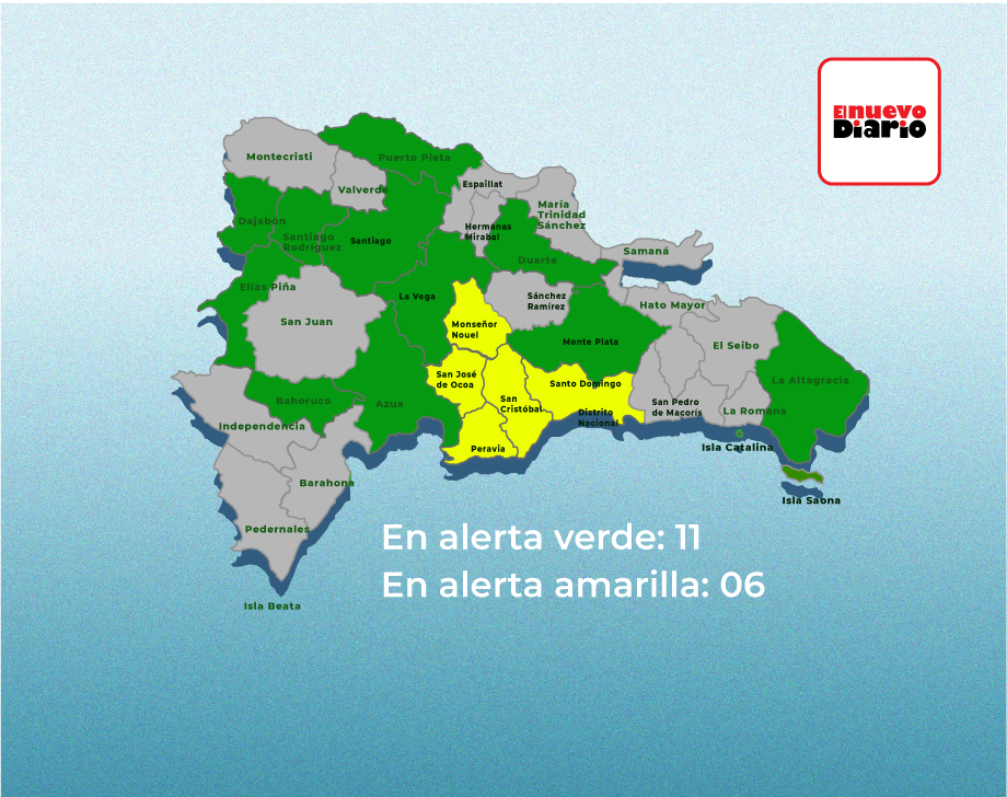 De acuerdo con la entidad, las provincias bajo alerta amarilla son Monseñor Nouel, San Cristóbal, San José de Ocoa, Peravia, el Gran Santo Domingo y el Distrito Nacional.