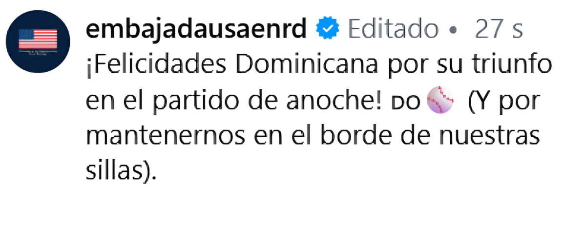 En su publicación, la representación diplomática expresó: “¡Felicidades Dominicana por su triunfo en el partido de anoche!”, acompañando el mensaje con símbolos del béisbol y de la bandera dominicana.