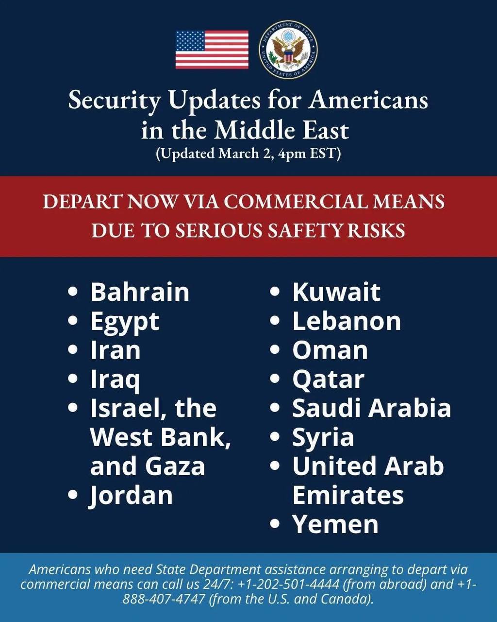 De forma oficial, el Departamento de Estado reiteró que los ciudadanos deben utilizar vuelos comerciales disponibles, seguir las orientaciones de cada embajada y mantenerse atentos a las actualizaciones oficiales.