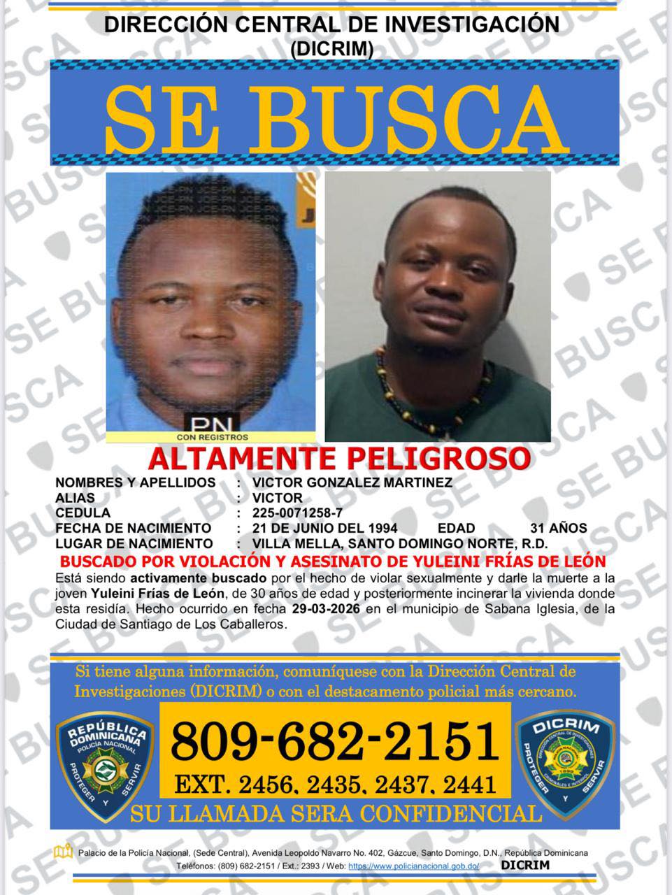 El sospechoso fue identificado como Víctor González Martínez, de 31 años, señalado como presunto responsable de la muerte de Yulenny Frías de León, de 30 años, ocurrida el pasado 29 de marzo.