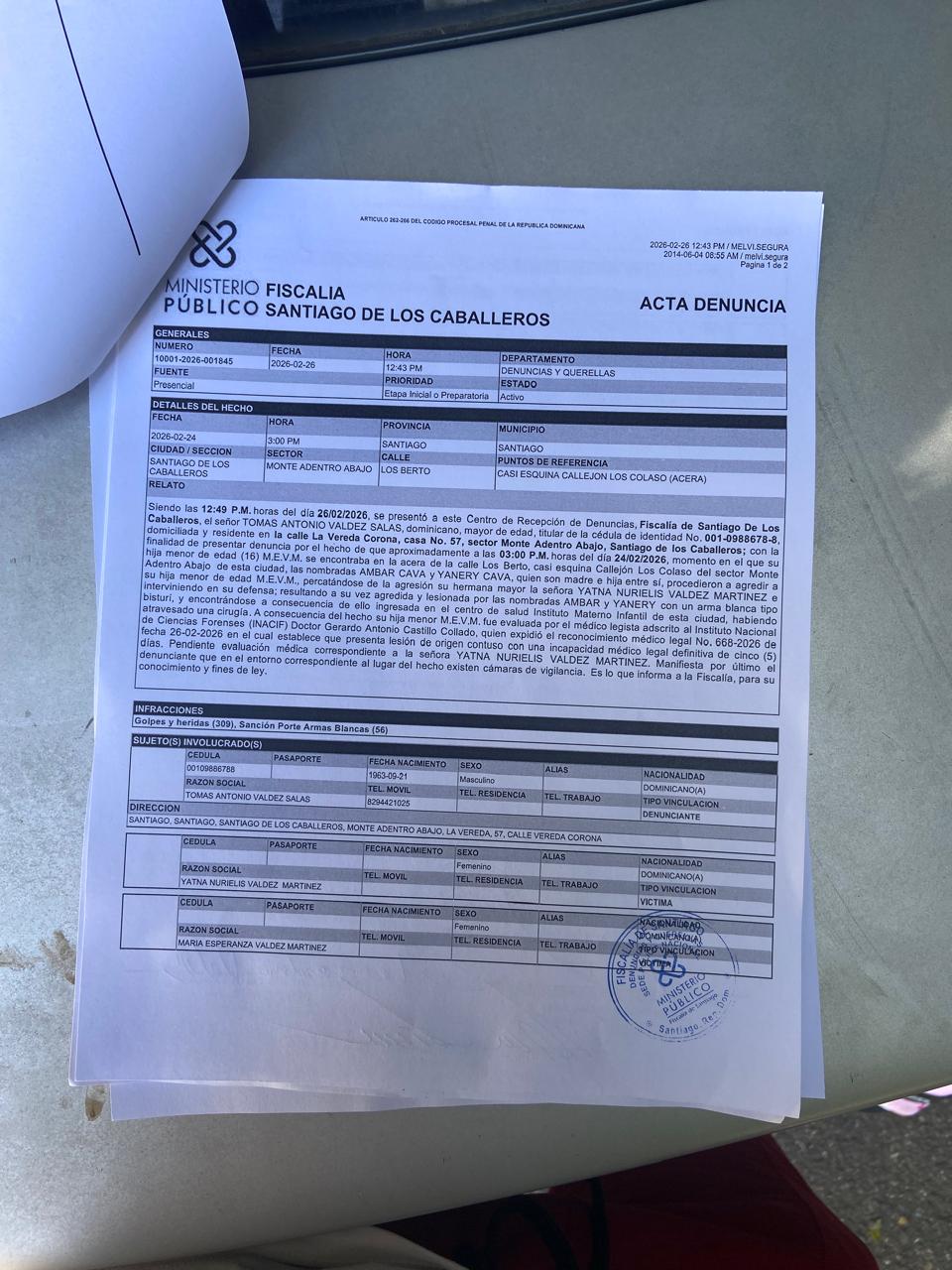El documento también incluye a la nombrada Yaneri Cava, quien también está siendo denunciada por el mismo incidente.