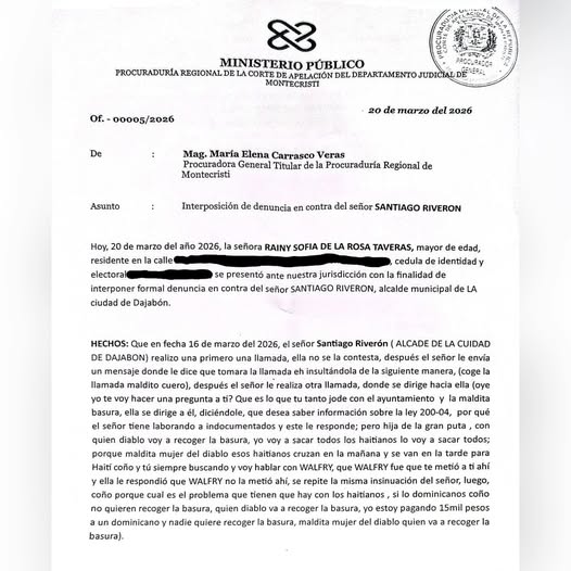 Diario al Día, Dajabón- Una joven presentó una denuncia formal ante la Corte de Apelación de Montecristi contra el alcalde Santiago Riverón, tras un incidente ocurrido durante una llamada telefónica.