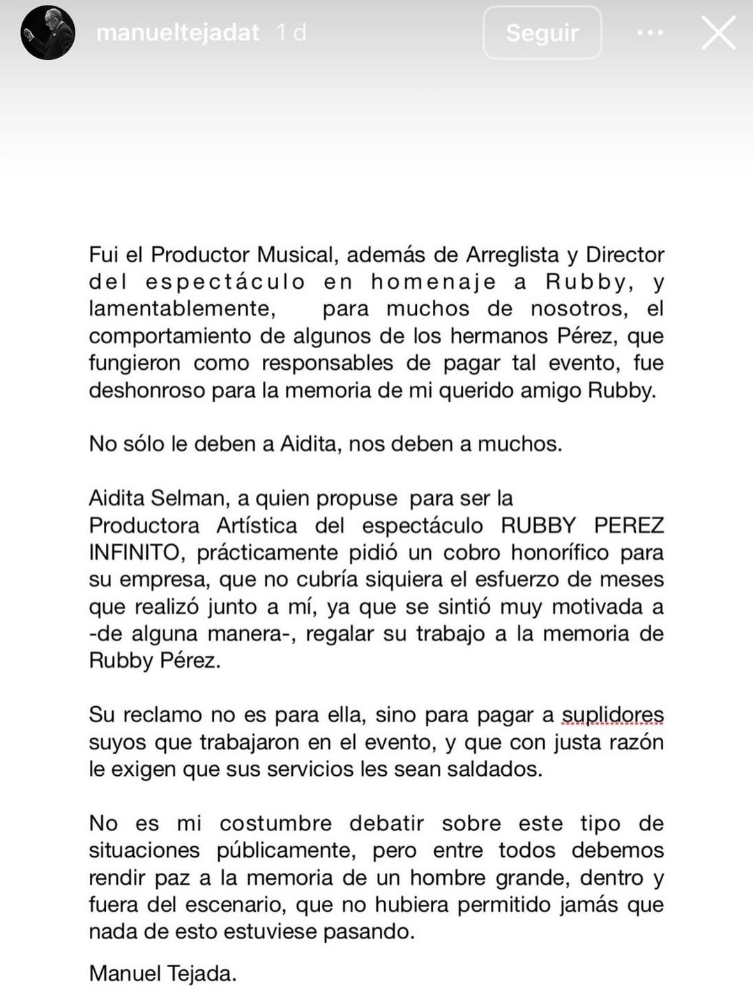 “Fui el productor musical, además de arreglista y director del espectáculo en homenaje a Rubby, y lamentablemente, para muchos de nosotros, el comportamiento de algunos de los hermanos Pérez, que fungieron como responsables de pagar tal evento, fue deshonroso para la memoria de mi querido amigo Rubby”, expresó Manuel Tejada.