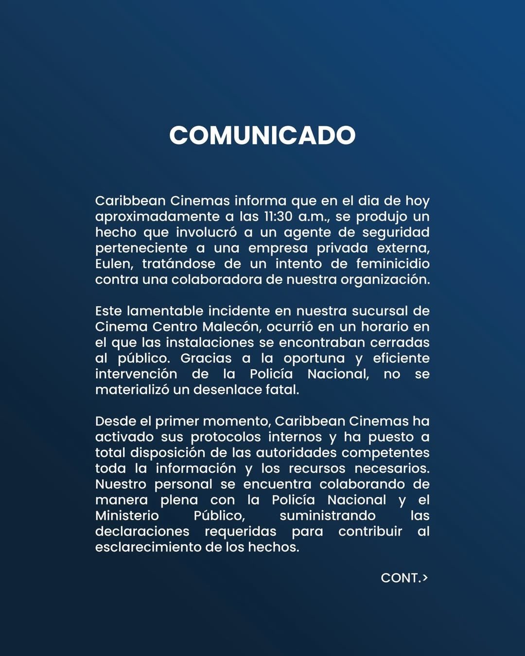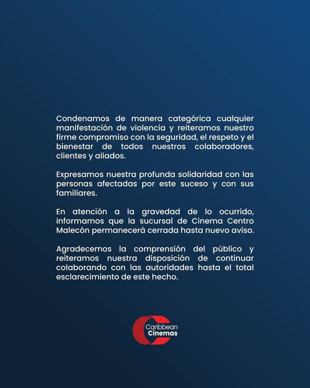 “’Agradecemos la comprensión del público y reiteramos nuestra disposición de continuar colaborando con las autoridades hasta el total esclarecimiento de este hecho’”, indicó Caribbean Cinemas en su comunicado oficial.