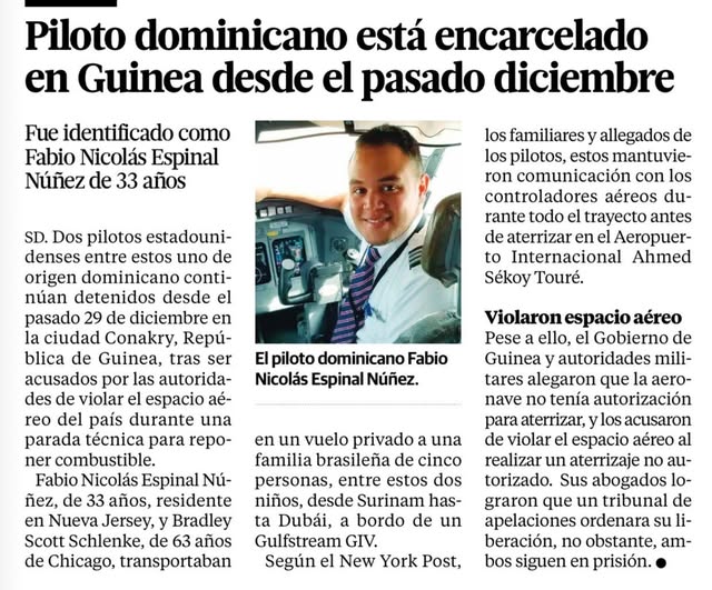 Diario al Día, Estados Unidos- Dos pilotos estadounidenses continúan retenidos en Conakry desde el pasado 29 de diciembre, acusados por autoridades guineanas tras un aterrizaje considerado no autorizado durante una escala técnica.
