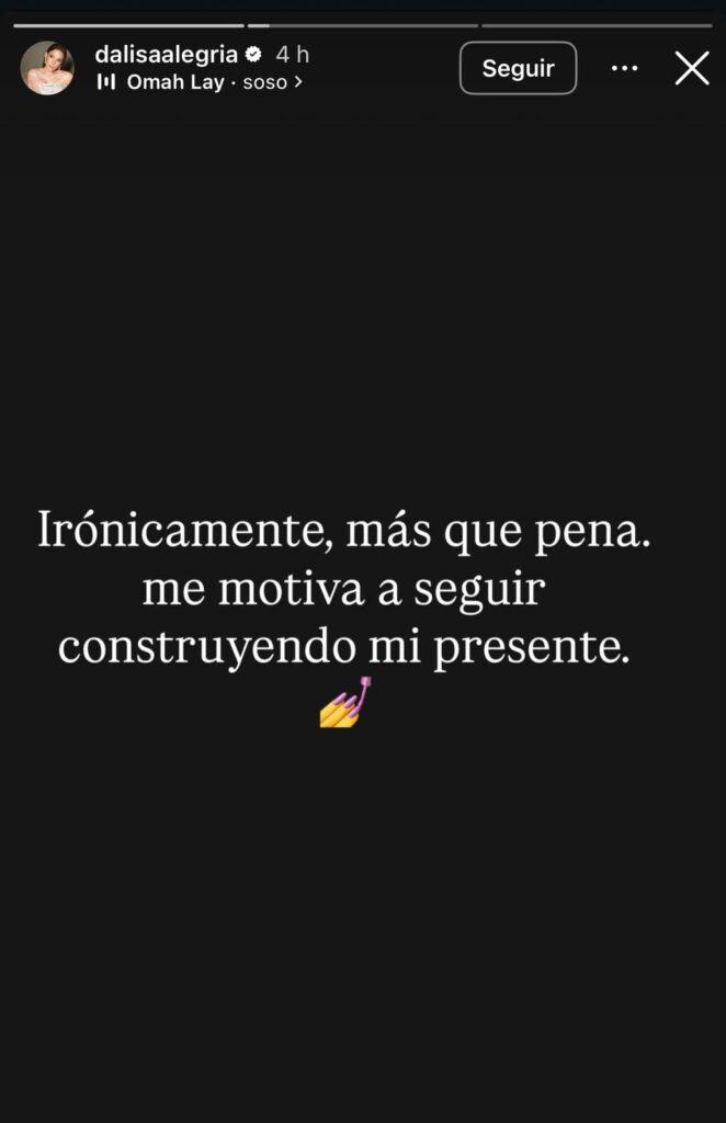 A este mensaje añadió otra publicación en la que expresó: “Irónicamente más que pena me motiva a seguir construyendo mi presente”, frase que también fue interpretada por seguidores como una posible respuesta a la publicación y un pronunciamiento hacia Alexandra.