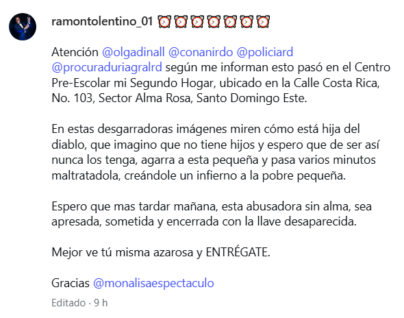 En su cuenta @ramontolentino_01, el comunicador etiquetó directamente a las autoridades @olgadinall, @conanirdo, @policiard y @procuraduriagralrd solicitando intervención inmediata en el caso denunciado.